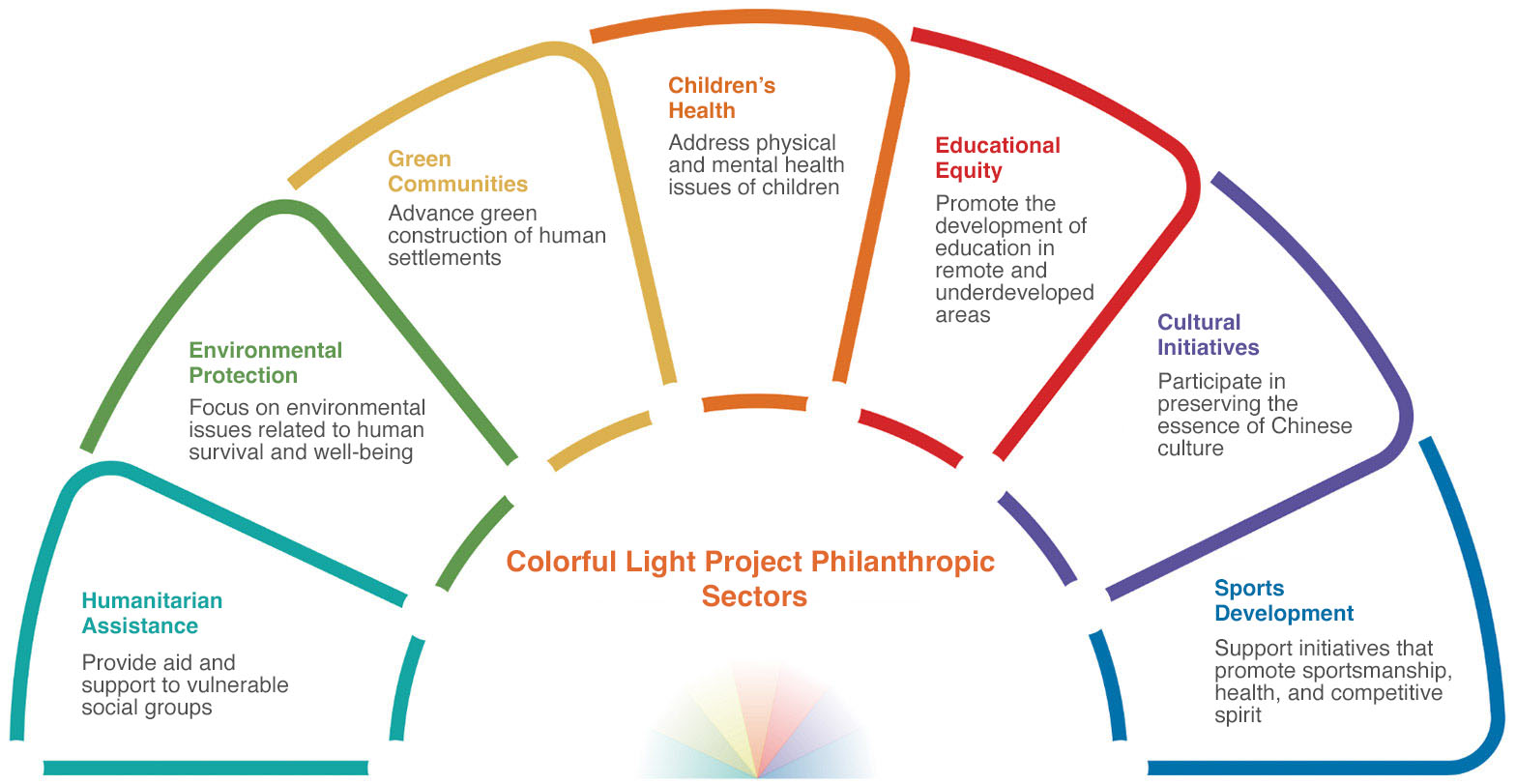 In 2013, Seazen Holdings launched the large-scale public welfare brand "Colorful Light Project," aiming to build a philanthropic platform leveraging the company’s resources and calling on widespread public participation. Through our actions, we gather greater social forces to convey Seazen's philanthropic commitment and enhance people’s well-being.Seazen Holdings seeks to drive public welfare innovation across seven sectors—educational equity, children’s health, green communities, environmental protection, humanitarian assistance, cultural initiatives, and sports—via the "Colorful Light Project." Each sector represents a ray of the "colorful light," striving to illuminate as many corners of society as possible. Seazen's team is committed to assuming greater responsibility, advancing societal progress bit by bit with warm, sustained efforts.